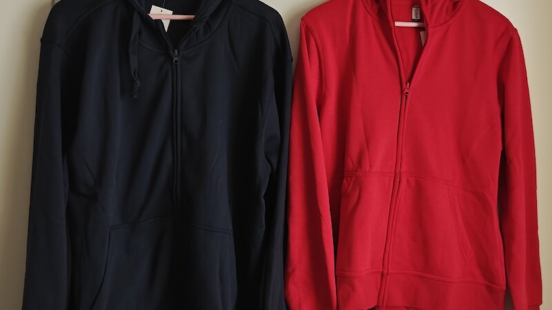 Ohessa kuva huppareista. Molemmat ovat XL-kokoa, joten huomaatte, että punainen niin sanottu naisten malli on huomattavasti pienempi ja se on kavennettu uuman kohdalta.
