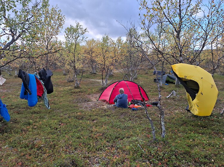 Vaelluksen reittisuunnitelma jätettiin melko väljäksi. Tarkoituksena oli seurata porukan kulkemista. Sunnuntaina kuljimme Peltojoen länsipuolta ja leiripaikka löytyi Lahtisen kämpän lähistöltä. Ilta oli lämmin ja kaikenlaista lentäjää oli liikkeellä, hyttysiä, polttiaisia ja mäkäräisiä. Ei niitä ennen ole tällaista määrää ollut syyskuussa.